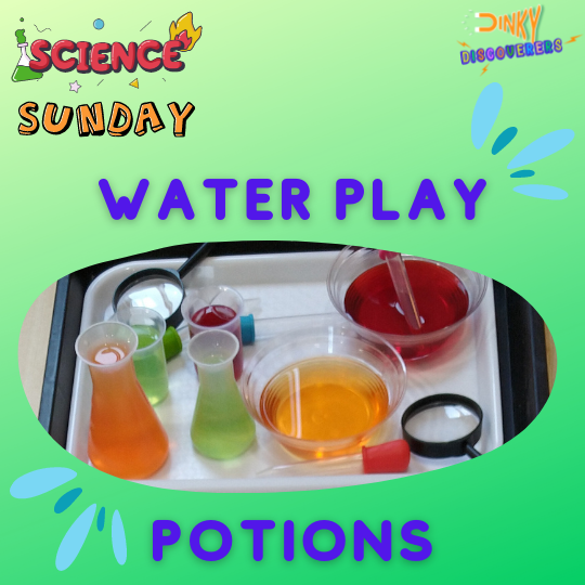 This week is water play potions! Simple water play is not to be underestimated both in its enjoyability, and its value to your child’s development. Put a scientific twist on your water play by adding different food colours to the water and watching the resulting colour mixing.