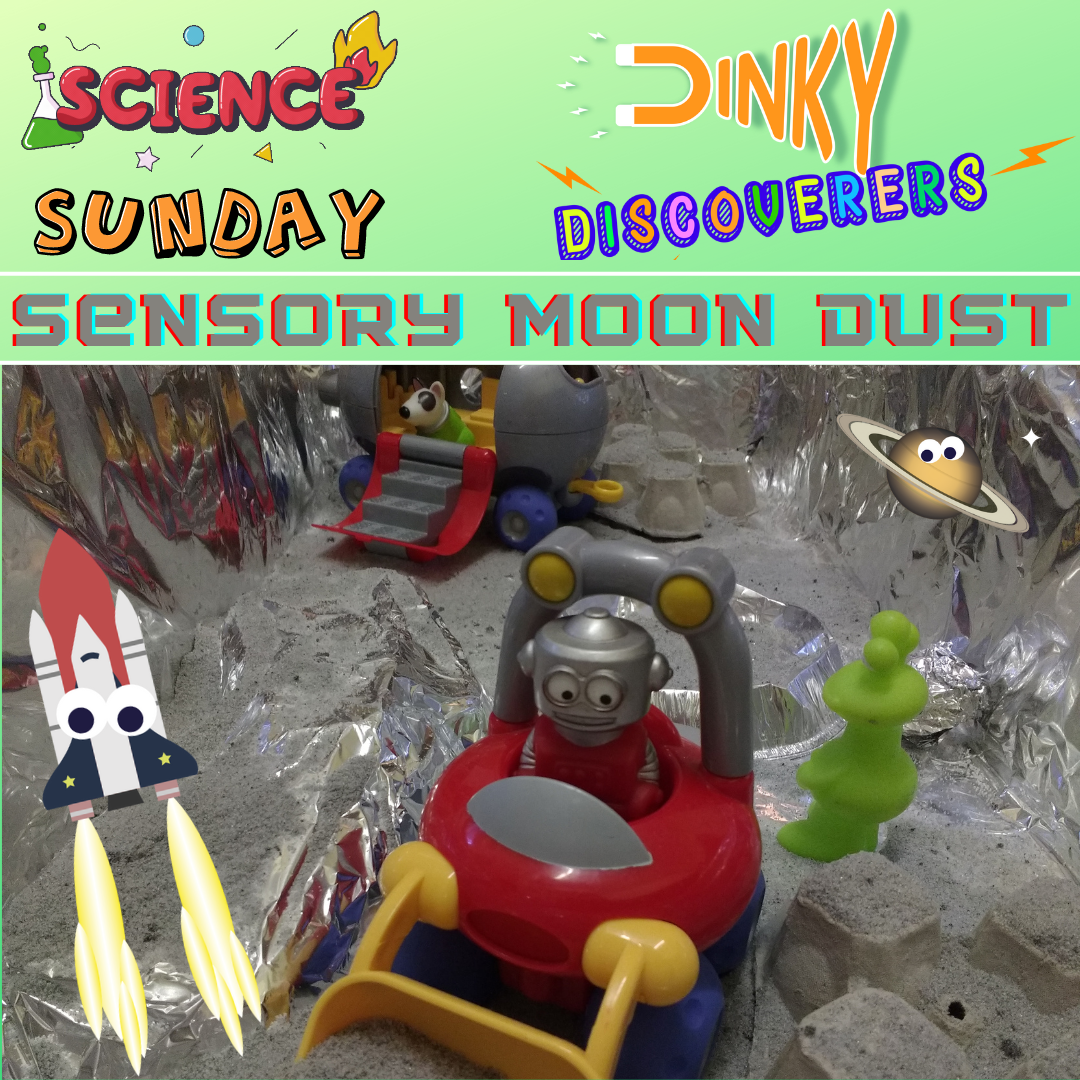 Imagine you have zoomed through space and landed on the moon! Let’s make some Moon dust and get out your favourite toys for some sensory moon play. I want to show you some of the super science you can explore along the way…
